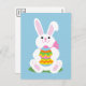 A cute Easter Bunny wearing a pink bow ribbon ever so happy holding on Easter Egg decorated in Spring colours filled with candy sitting on a patch of green grass with a robins egg blue background. Send this postcard to a little or big girl or a family or friend to wish them a Happy Easter.