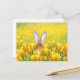 Flemish Giant Bunny rabbit lost in yellow tulips either hunting for or hiding Easter eggs cute holiday postcard
