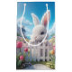 A cute white rabbit peeks over a picket fence surrounded by colourful tulips and a bright spring garden.