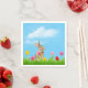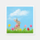 Spring tulips in grass with cute brown Easter bunny and blue sky background