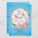 This festive Easter invitation features a white bunny with a spring-floral background and decorated Easter eggs against a blue-speckled background.