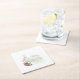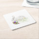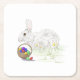 Paper coaster with an original pen and ink illustration of a realistic bunny and colourful basket with Easter eggs