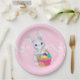 This paper plate is shown in a festive Easter Bunny with eggs print in a pink colour.