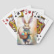 Playing cards with a cheerful rabbit in a blue outfit carrying a basket filled with colourful, decorated eggs. The background features soft floral details and gentle, warm colours.