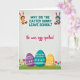 This greeting card features a light gray background with a faint speckled shimmer and a springtime joke set front and center. Across the top, a teal question in rounded lettering asks, “WHY DID THE EASTER BUNNY LEAVE SCHOOL?” and it’s framed by two cute, wide-eyed children who lean slightly inward like close friends sharing a secret 🐰. One child wears a sunny yellow hood with long animal ears, and the other wears an aqua hood with matching ears, both smiling warmly while holding small woven baskets. Beneath the question, the punchline “He was egg-spelled,” appears in bright magenta, written in a flowing cursive style that curves gently across the middle. The lower half turns into a rolling green field sprinkled with tulips in several colors, adding a soft garden feel 🌷. Three large decorated eggs sit prominently in the grass—one purple, one teal, and one golden yellow—each outlined clearly against the green. White decorative details cover the eggs, including wavy swirls, dotted patterns, and tiny star-like flowers.
