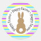 This design starts with pastel coloured stripes and features the silhouette of a brown rabbit. The message is “Happy Easter”.