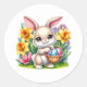 Round sticker is shown with a cute Easter bunny and flowers art print.