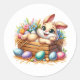 Round sticker is shown with a cute Easter bunny art print.