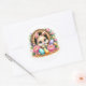 Round sticker is shown with a cute Easter bunny and flowers art print.