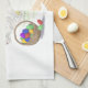 Kitchen towel with an original illustration of a realistic rabbit and colourful basket of Easter eggs.