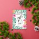 Celebrate the season with this cute and personalized Happy Easter card featuring a replica of my original watercolor art. A sweet bunny rabbit (hare) is surrounded by soft pink flowers and lush botanical greenery in fresh spring hues, creating a cheerful yet elegant design on a crisp white background. “Happy Easter” appears in modern gold foil typography, and you can customize the wording to add your own greeting or even adapt it for another occasion. The inside features a complementary turquoise green, which can be changed to white or any colour you prefer. Perfect for those wondering where to find unique Easter greeting cards, this design offers a heartfelt, artistic alternative to ordinary cards. Assorted Easter cards are available in my online shop, and you can order multiple quantities to save on your spring stationery. To see more Easter cards by Victoria Grigaliunas, visit www.zazzle.com/dotellabelle