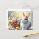 This charming postcard features a soft pastel oil painting illustration of a fluffy bunny sitting beside a basket of spring flowers and colorful Easter eggs. The artwork has a gentle style with warm sunlight, delicate blossoms, and soft pastel tones that capture the peaceful feeling of spring.