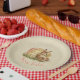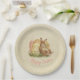 These sweet Easter Bunny paper plates featurea beautiful watercolor painted bunny rabbit sitting up against pretty coloured Easter eggs. Typography on the front says Happy Easter below him in a dark peachy pink with a white edge. The bunny is set against a faux linen pale yellow background.