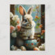 A fluffy bunny is sitting in an intricately painted china tea pot, surrounded by flowers and painted eggs