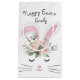 Cute Easter bunny with pink ears, heart nose, eyelashes, and spring flower headpiece on white background.