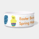 Easter Bunny spring water is written in orange text. Leave wording, or personalize carrot juice. Personalize name. Cute brown rabbit with long pink ears. Blue, green, purple decorated eggs. Cute yellow chick striped egg. Original Artwork © TamiraZDesigns.