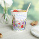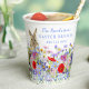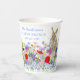 Modern Easter brunch and egg hunt personalized family name paper cup with cute Easter bunny and colourful watercolor wildflower meadow. Ideal for spring garden party. Cornflower blue handwriting typography script with easy to use templates so you can add a family name. whimsical design perfect for a spring garden party Easter egg hunt. Original artwork by artist Catherine Sweetman