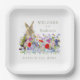 Easter egg hunt personalized family name welcome paper plate with cute Easter bunny and colourful watercolor wildflower meadow. Ideal for spring garden party and Easter brunch and egg hunt boxes. Sage green handwriting typography script with easy to use templates so you can add a family name. Simple modern minimalist design perfect for a spring garden party Easter egg hunt. Original artwork by artist Catherine Sweetman