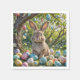 A cute bunny sits surrounded by colourful, decorated eggs under a tree with hanging eggs