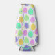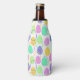 This bottle cooler has a Easter design of eggs in purple, yellow, green, blue, and pink scattered about with their outlines.