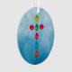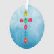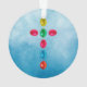 Cross made of colourful Easter eggs isolated against blue textured background which serves as sky. Happy Easter!