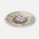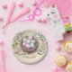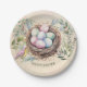 Colourful Easter eggs are displayed in a bird's nest among green leaves to welcome the springtime holiday on this pretty plate. A small pink and yellow bird sits on a leaf nearby wondering how those eggs got in the nest. The background is a watercolor textured cream while leafy branches surround the nest. Add a custom message below. Perfect for your Easter brunch or luncheon, or a family and friends Easter egg hunt. Available with matching products.