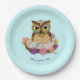 Cute Easter Owl sitting in a nest of pastel coloured easter eggs and flowers against bright blue