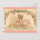 This is wonderful antique artwork from an early old Easter post card that shows a small girl playing with some cute yellow chicks that are hatching. She has a bow in her hair and a beautiful pink dress on all on a peachy background. The Easter greeting, "May Easter every year renew the heart of childhood's faith for you" is written in the same gold as the garlands and scrolls arching over the little girl.
