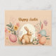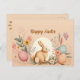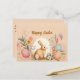This pretty pastel-coloured Easter greeting card features an Easter bunny surrounded by eggs and spring flowers. The tangerine coloured background of the card is sure to catch the eye and surprise your loved ones who receive it. Happy Easter!