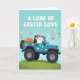This card shows a teal open-top utility vehicle climbing a gentle green hill, dotted with small white heart decals that hint at a sweet delivery. A long-eared white bunny with rosy cheeks sits at the wheel, looking ahead with a bright, friendly focus 🐰. In the back, a wooden crate holds four decorated oval eggs painted in spring shades like pink, blue, purple, and yellow, each with its own tidy patterns. The scene feels like a caring gesture in motion, as if the driver is bringing something special to a friend just over the rise. Across the top, the phrase “A LOAD OF EASTER LOVE” appears in large white letters, centered and easy to read against the sky. Behind everything, the background fades from deeper blue to pale pastel tones, giving the day a soft, airy look 🌷. A scatter of heart shapes in pink, peach, and white drifts around the vehicle, some small and some larger, like confetti falling through the open air. The bunny’s ears tilt back slightly as the big tires roll upward, with hearts floating across the blue gradient sky.