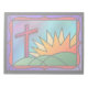 A stained-glass design illustrating Easter morning, with a red cross standing on green hills beside a fiery sunrise.
