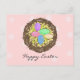 A pretty design to say 'Happy Easter' a soft pink and white polka dot background. A twig nest filled with colourful Easter eggs.