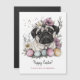 Cute pug Easter botanicals postcard. Rustic watercolors and lineart style pastel colour pug with Easter eggs and floral botanicals. Personalized text with a lovely trendy script.