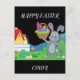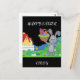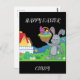 Colourful Easter bunny, basket, & house postcard with personalized name for kids.