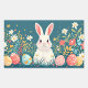 Cute white rabbit with a flower background and easter eggs on both sides of the rabbit