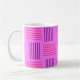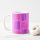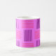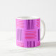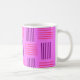 This mug has a mid-century modern design that looks like a weave with purple and pink lines on a field of lighter purple.