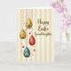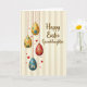 This design shows four egg-shaped ornaments hanging down the left side from small red beaded chains, arranged like a gentle cascade that feels a bit like friends leaning close for a photo. Two eggs shine in warm gold, one is deep red, and one is teal, giving the group a cozy mix of tones that still stands out. Each egg is covered with tiny floral details and curling vine patterns in blue, orange, white, and gold, as if they were dressed up for a spring celebration 🌷. Behind them, the background stays soft with vertical stripes in cream and pale beige, letting the hanging eggs take the spotlight. Small heart shapes in reds and blush pink are scattered around, adding a tender, affectionate touch to the scene. On the right side, the words “Happy Easter Granddaughter” appear in flowing brown lettering, balanced neatly against the ornaments 🐰. The eggs have a glossy, light-catching look while the striped background stays more matte, and the hearts sit lightly between them and the text.
