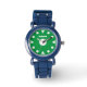 Easy to tell time kid's watch with custom name. Personalized wrist watches printed with name or monogram letters. Cute Birthday gift idea for boys and girls. Sporty design with numbered bezel. Chirldren's presents with simple dial design for easy learning. Perfect for son, grandson, nephew, grandchild, friend etc. Green or custom colour background. Black leather strap.