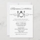 Black and white wedding rehearsal and rehearsal dinner invitation design with an eat, drink, and be married theme in elegant and vintage mixed typography with diamond engagement ring place setting scroll feature.