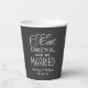 Wedding paper party cups feature an elegant "Eat, Drink, and Be Married" mixed typography quote design in white with a charcoal grey / soft black background colour - note, colours can be customized. Personalize with the bride and groom names and their wedding date.