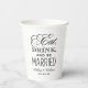 Wedding paper party cups feature an elegant "Eat, Drink, and Be Married" mixed typography quote design in black with a clean white background colour - note, colours can be customized. Personalize with the bride and groom names and their wedding date.