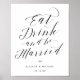 Simple Elegant Calligraphy Script Wedding Reception Eat Drink and be Married Sign in beautiful flowing fancy letters and your personalized names, location, and date. A stylish yet simple formal design in black and white or any background colour you choose. Just click the customize further link, shown under the text personalization area on the right, and choose your custom colour background. This sign poster template makes it fast and easy to create stunning additions to your wedding decor. Signs can be enlarged, there are many sizes to choose from, as well as options for custom framing and matting. Welcome to our wedding custom signage.