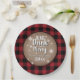 A fun, classic pattern of black and red buffalo check background with a kraft paper style centre, cute snowflake accents with your personalized Christmas message for your festive party guests.