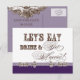 Elegant and fun fonts announce the message, "Let's eat, drink and get married!" on a delightful whimsical save the date announcement postcard. In a clean, crisp, lavender, plum purple, chocolate brown and white colour palette it's the best of vintage with a modern twist.