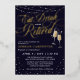 Elegant Eat, Drink and Be Retired retirement party invitation with string lights, stars and flares, and champagne flutes against a deep dark blue background with gold foil details. Invite your friends, family members, and coworkers to a night of celebrating your retirement with these glamourous retirement invitations in darkest blue with champagne flutes clinking together and magical string lights! Eat, drink and be retired in gold foil with string lights, stars, flares and champagne bubbles in gold foil as well.