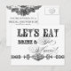 Elegant and fun fonts announce the message, "Let's eat, drink and get married!" on a delightful whimsical Bridal Shower invitation postcard. In a clean, crisp, black and white colour palette it's the best of vintage with a modern twist. Add your Bridal Shower invitation easily to the reverse side.
