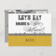 Elegant and fun fonts announce the message, "Let's eat, drink and get married!" on a delightful whimsical Maid of Honour invitation postcard. In a clean, crisp, mustard gold, grey, black and white colour palette it's the best of vintage with a modern twist. Easily customize your rsvp information on the reverse side.