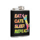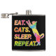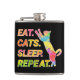 Celebrate your feline affection with this vibrant flask showcasing the phrase "Eat, Sleep, Cats, Repeat." Perfect for cat enthusiasts, this artwork captures the daily joy of living with cats.