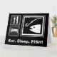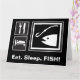 Striking black, white and grey coloured sign board style graphics depicting the necessities of life. Small eat and sleep icons using the standard food service knife and fork, and motel lodging roof and bed pictures. Extra large FISHING graphic showing a fish head and fishing hook, because of course fishing matters more than eating and sleeping! Blank inside for your own personal handwritten message, and large enough for several people to sign. Perfect for special occasions such as birthdays or retirements.