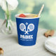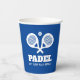 Eat Sleep Play Padel funny custom colour paper cups. Crossed racquet design for kids and adults. Personalize with your own text. Fun disposable party supplies for padel players, tennis friends, club, team etc. Blue or custom background colour. Great for Birthday party, sports event and more.